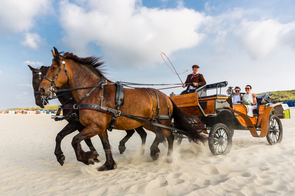 Die Insel Juist ist autofrei. Die Besonderheit ist, dass Waren, Güter und Menschen statt mit Kraft- und Elektrofahrzeugen mit Kutschen transportiert werden.