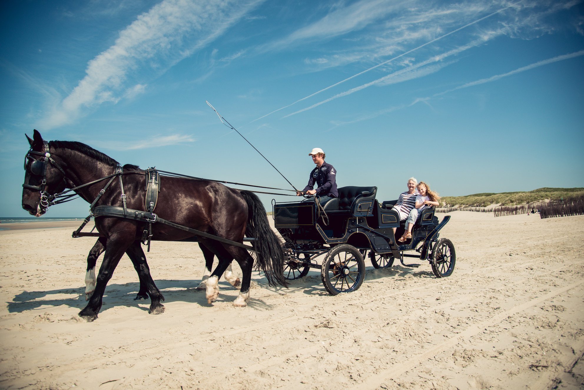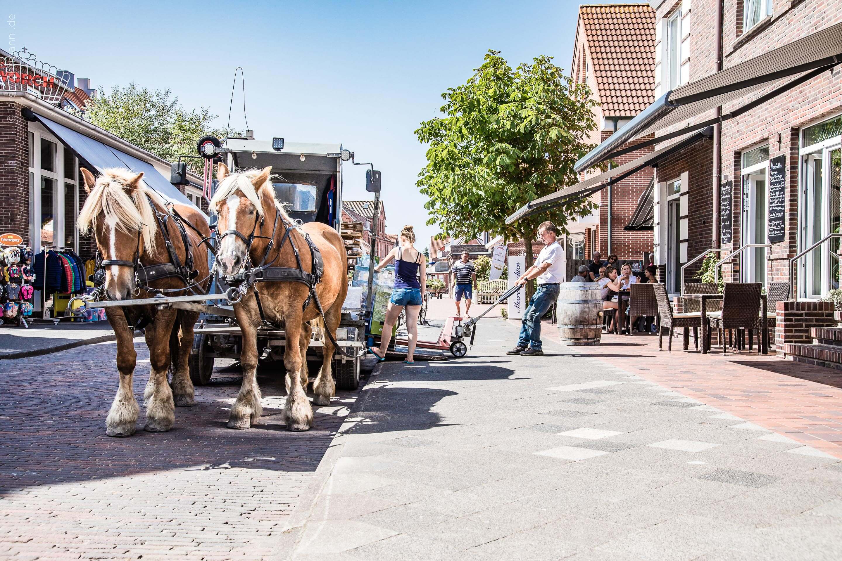 On the car free island Juist, one particularity is that goods and people are transported with carriages instead of motor or electric vehicles. Also the waste collection is managed by horse-drawn vehicles, and solely for the distribution of packages the post service is allowed to use electric vehicles.